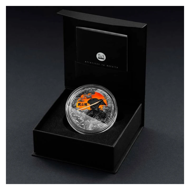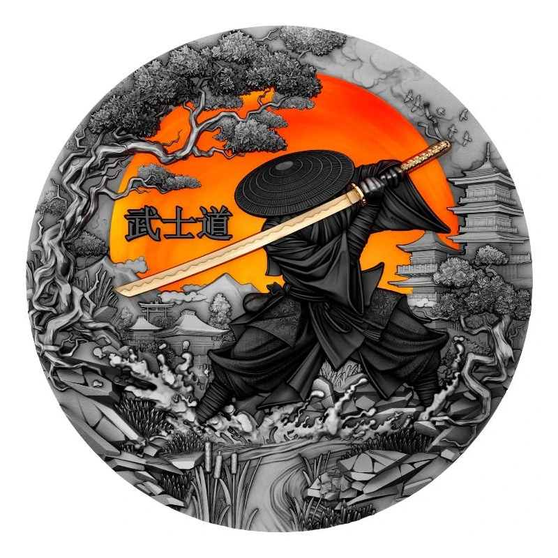 This exquisite 2 oz. silver coin commemorates the ancient Japanese code of honor, Bushido, which inspired samurai for centuries. The reverse depicts a brave samurai with a katana standing against the background of a bright rising sun - the symbol of Japan. Executed as an antique finish, the coin combines intricate high relief and selective gilding to accentuate its impressive design. It comes in a themed case with a certificate of authenticity. The mintage is limited to only 500 pieces worldwide.