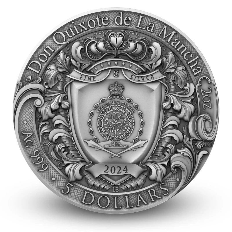The obverse of the coin features the coat of arms of Niue, as well as the inscriptions: “Don Quixote de la Mancha” - the name of the coin, “Ag 999” - silver proof, “2024” - year of issue, “5 DOLLARS” - face value and “2 OZ” - weight of the coin.