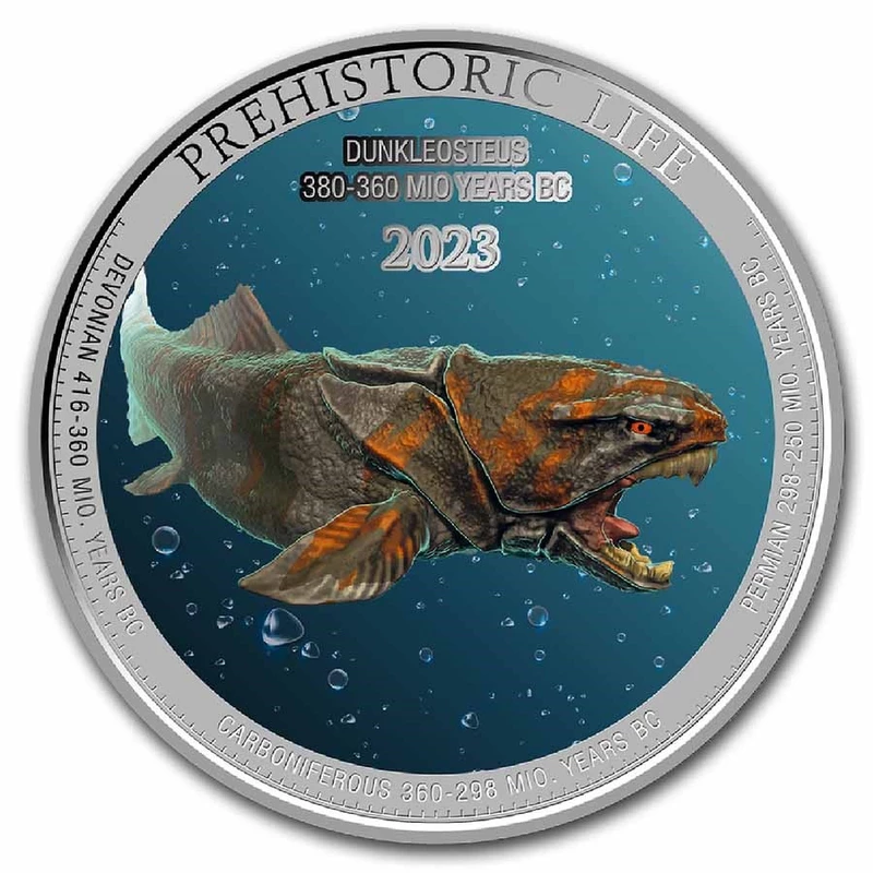Silver coin of the Republic of Congo "Prehistoric Life. Dunkleostei" (in color) 2023g., 31.1 g. pure silver (0.9999 proof)