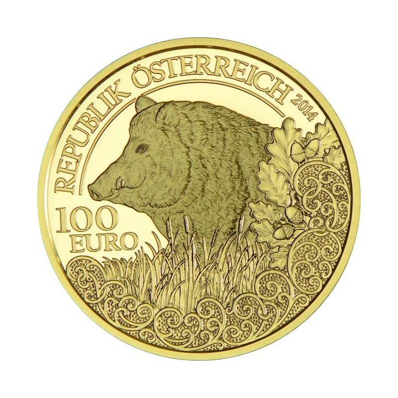 Austrian gold coin "Wildlife. Wild boar" proof, 2014, 16 g. pure gold (0.986 proof)