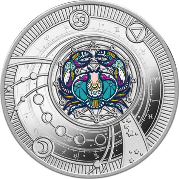Kamerun: Silber-Sammlermünze Tierkreiszeichen. Krebs 2025 (Anhänger), polierte Platte, koloriert, 10 g reines Silber (0,999)