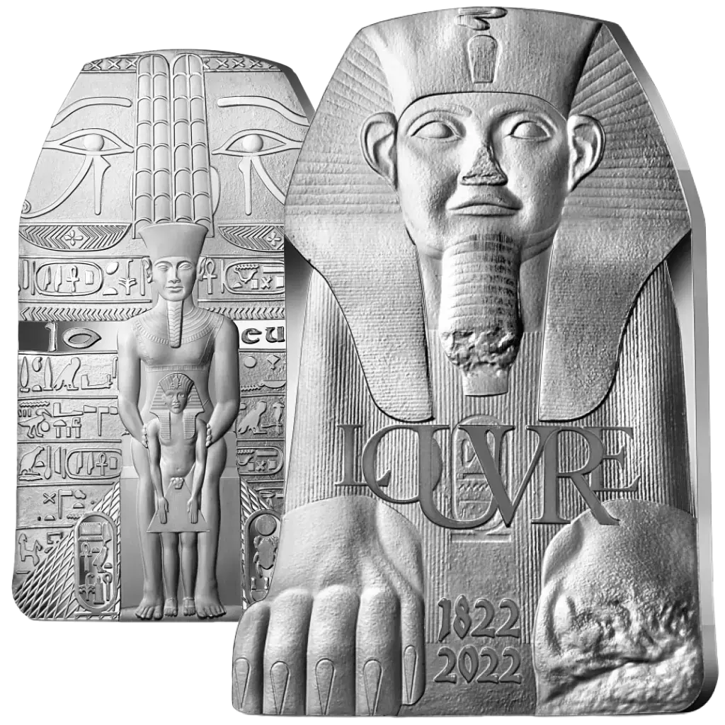 Diese im Jahr 2022 von der Monnaie de Paris in Zusammenarbeit mit dem Louvre-Museum herausgegebene polierte Platte enthält 22,2 g Feinsilber von 0,999. Der Nennwert beträgt 10 Euro, und die Auflage ist auf 5.000 Stück begrenzt. Die Ausgabe ist Teil der Serie French Excellence", die zwei historische Institutionen an den gegenüberliegenden Ufern der Seine würdigt. Die Münze ist dem Thema Schätze Ägyptens" gewidmet und erinnert an den 200. Jahrestag der Entzifferung der Hieroglyphen (1822-2022) und den 100. Jahrestag der Entdeckung des Grabes von Tutanchamun. Ihre Form ist der Großen Sphinx von Tanis nachempfunden, die im Louvre ausgestellt ist. Auf der Rückseite ist das vergoldete Bronzegehäuse des Gottesanbeters Shepenupet zu sehen. In der Mittelachse ist der Gott Amun dargestellt, der über den jungen Tutanchamun wacht. Unten ist eine Pyramide als Symbol für die Kontinuität des Erbes neben den Kartuschen von Tutanchamun zu sehen. Der Nennwert und die Initialen der RF werden in der Mitte zusammen mit dem Münzzeichen angezeigt.