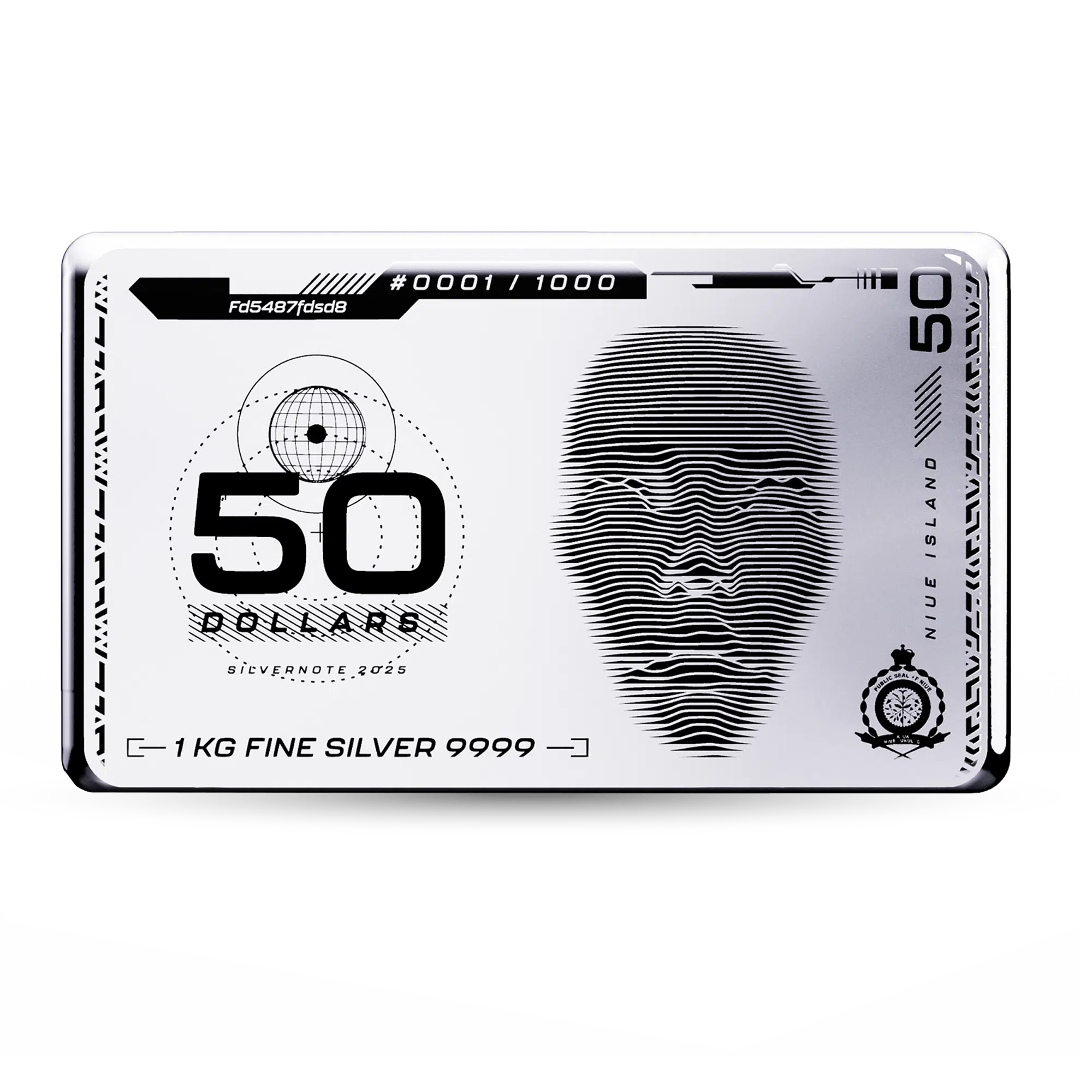 Der Niue-Silbermünzenbarren 2025 kombiniert das Format eines Goldbarrens mit dem Status eines gesetzlichen Zahlungsmittels. Geprägt aus 1 Kilogramm 0,9999 Feinsilber, trägt er einen Nennwert von 50 NZD und ist weltweit auf nur 1.000 Stück limitiert. Das rechteckige Format (93,5 × 58 mm, Dicke 18,5 mm) unterstreicht seine moderne und technische Ästhetik. Das Design umfasst sicherheitsrelevante grafische Elemente, eine Seriennummerierung und ein stilisiertes Porträt, das aus dynamischen Linienmustern besteht. Die fette Aufschrift 50 DOLLARS" unterstreicht den Status als gesetzliches Zahlungsmittel, während 1 KG FINE SILVER 9999" die Reinheit der Münze hervorhebt. Mit seiner hohen Feinheit, seinem beträchtlichen Gewicht und seiner begrenzten Auflage hebt sich dieser Kilo-Silbermünzenbarren als unverwechselbare Ausgabe hervor, die sowohl für Sammler als auch für ernsthafte Edelmetallinvestoren interessant ist.