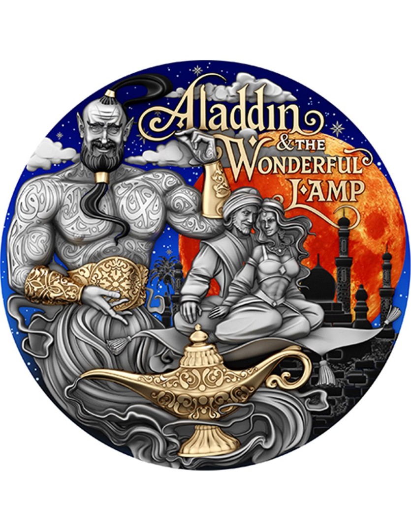 Niue: Silbermünze Aladin und die Wunderlampe 2025 vergoldet koloriert 2 Unzen