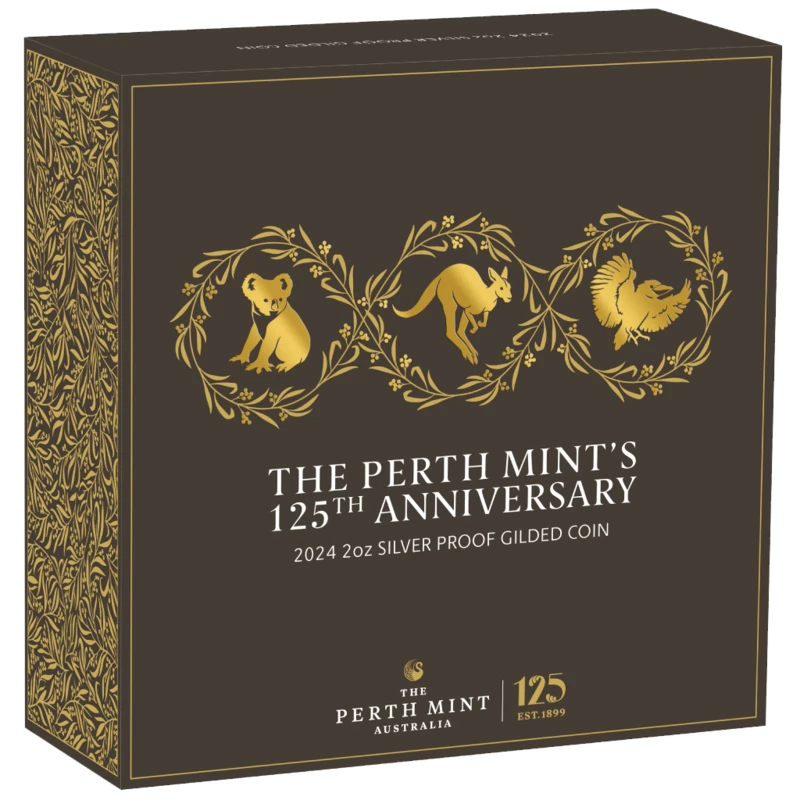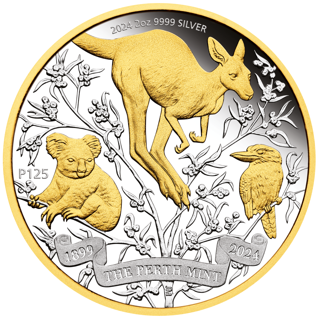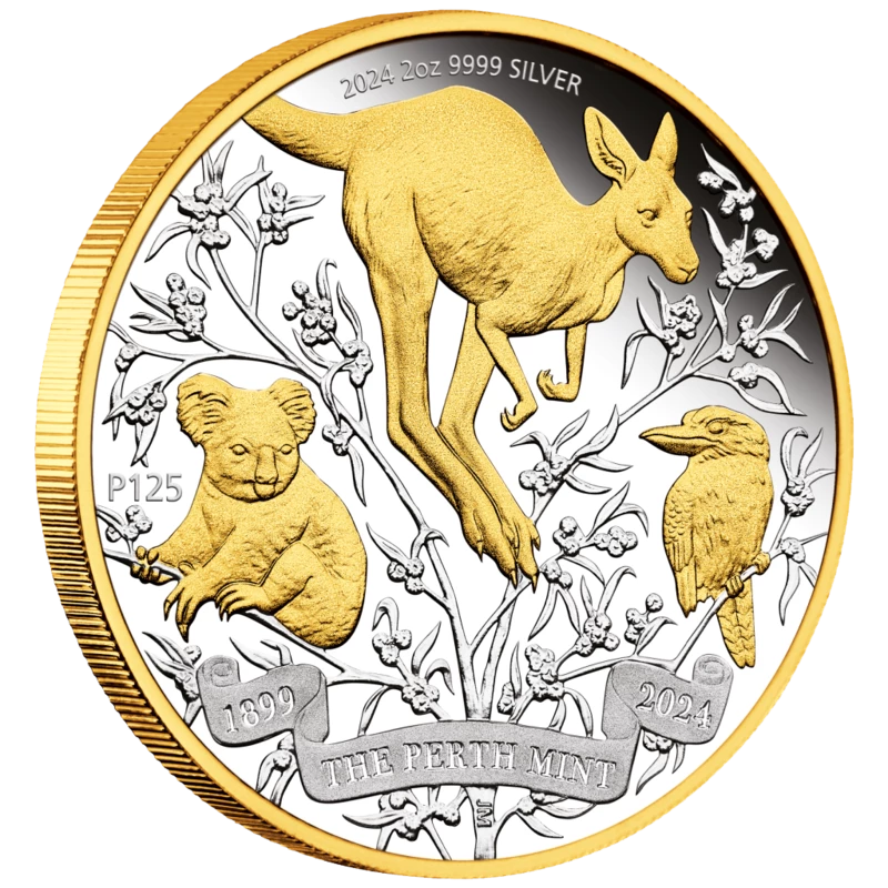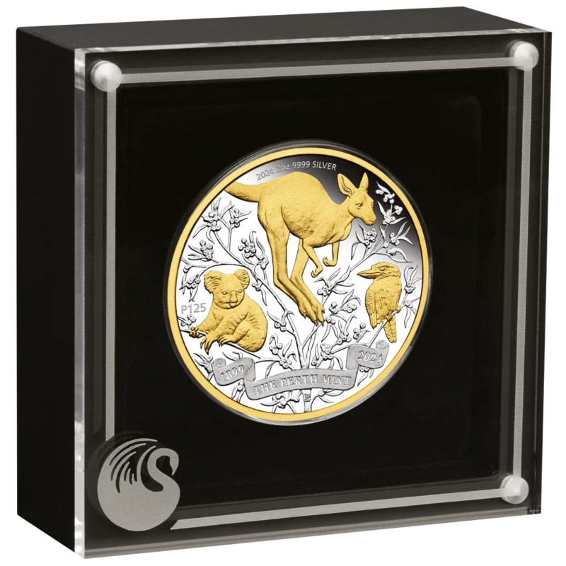 Australische Silbermünze "125th Anniversary of the Perth Mint: Koala, Känguru, Kookabarra" (vergoldet), 2024, 62,2 g reines Silber. (0,9999 Proof)