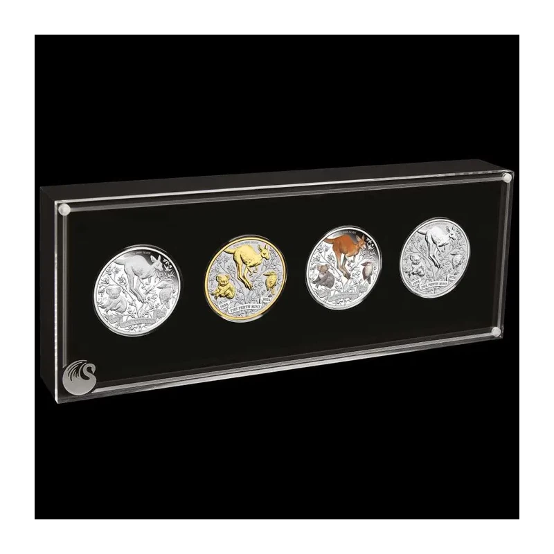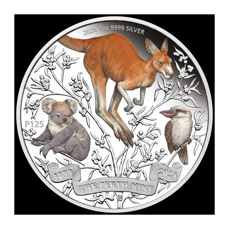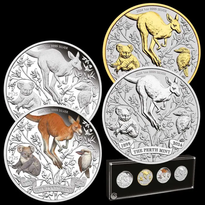 Australische Silbermünze "125. Jahrestag der Perth Mint: Koala, Känguru, Kookabarra" (Satz 4 Stück*31,1), 2024, 31,1 g reines Silber. (0,999 Proof)