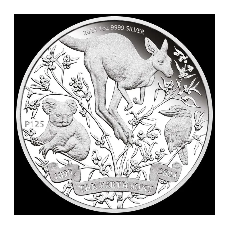 Die Rückseite zeigt einen Koala, ein Känguru und ein Kakabarra, die kunstvoll in einem goldenen Flechtwerk, dem nationalen Blumenemblem Australiens, angeordnet sind. Auf dem Münzrand sind die Jahreszahlen 1899 und 2024 eingeprägt, was auf das 125-jährige Bestehen der Perth Mint hinweist. Das Gewicht der Münze, der Proof, das Ausgabedatum und das Münzzeichen "P125" vervollständigen das Design.