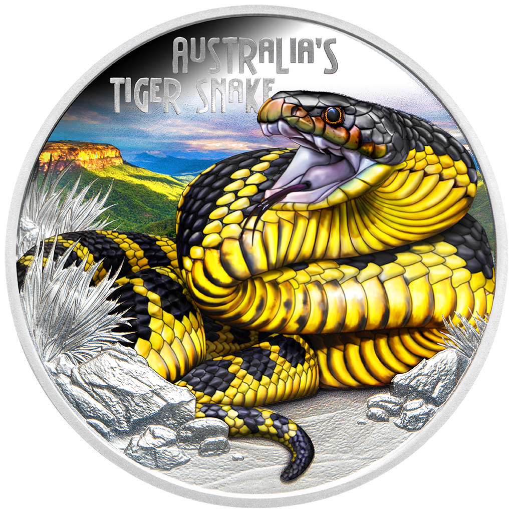 Tuvalu Silbermünze "Tödlich und Gefährlich. Tiger Snake" 2025 (Proof, koloriert), 31,1 g. reines Silber (0,9999 Proof)