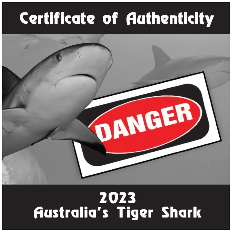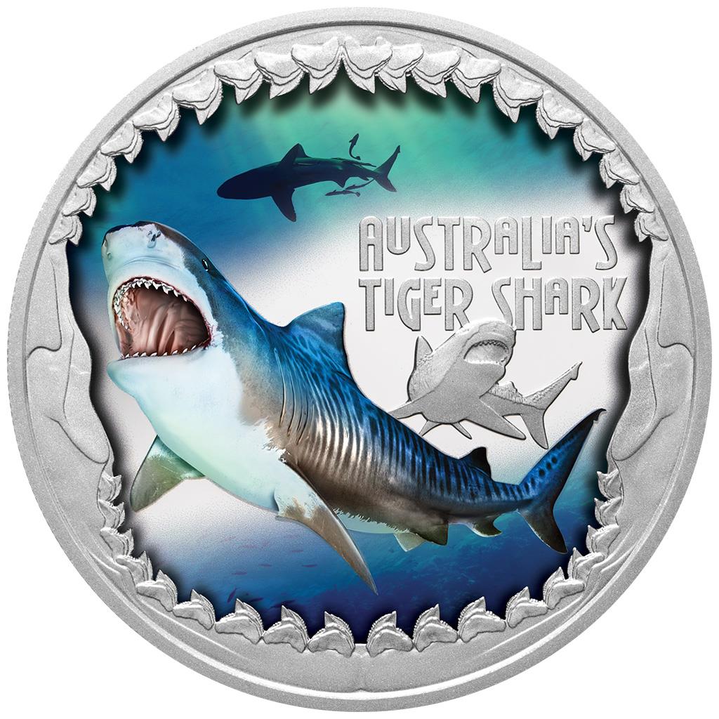 Tuvalu Silbermünze "Tiger Shark" (Proof, koloriert) 2023, 31,1g. reines Silber (0,9999 Proof).