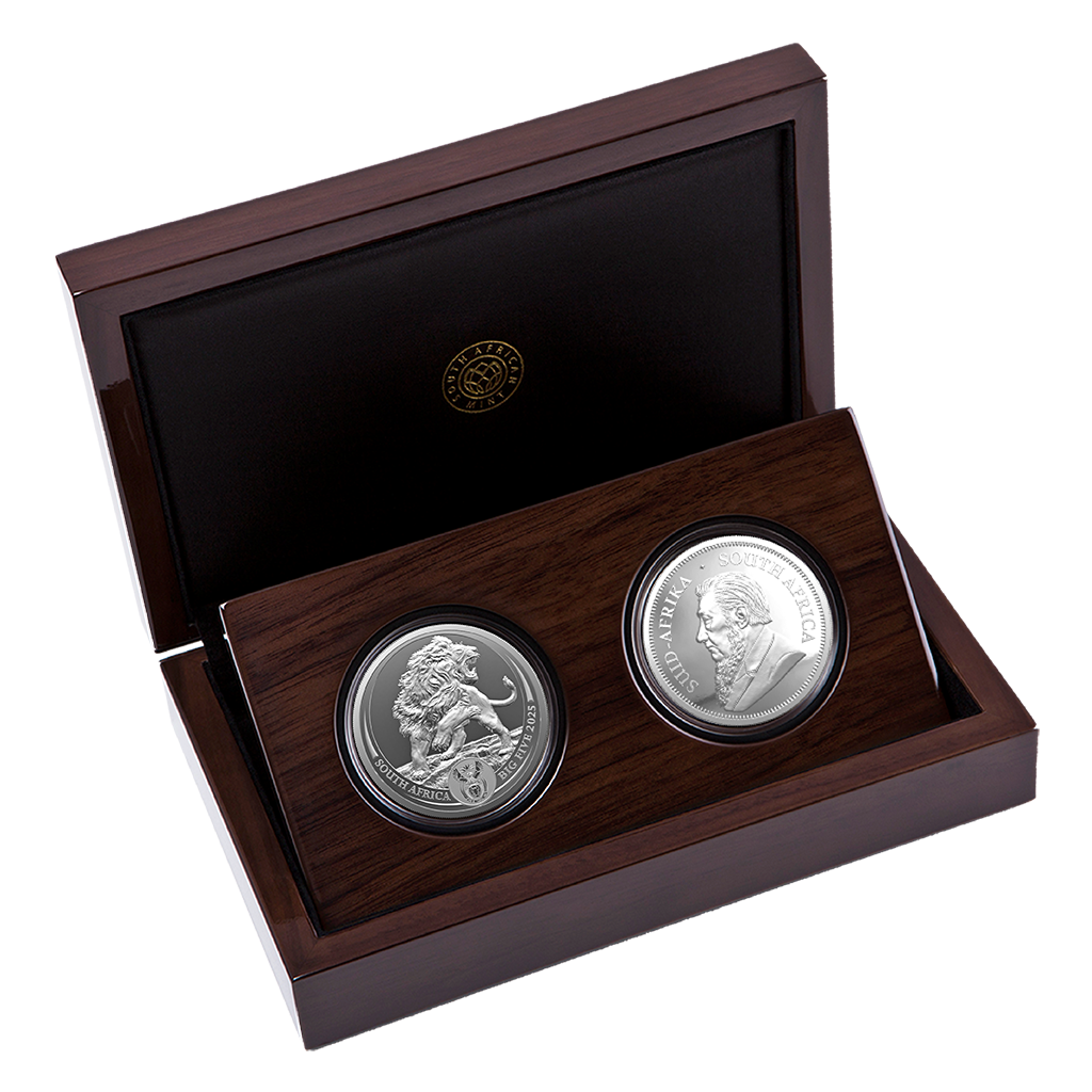 Südafrika: Silbermünzen Löwe und Krügerrand 2025 polierte Platte Satz 2 Unzen