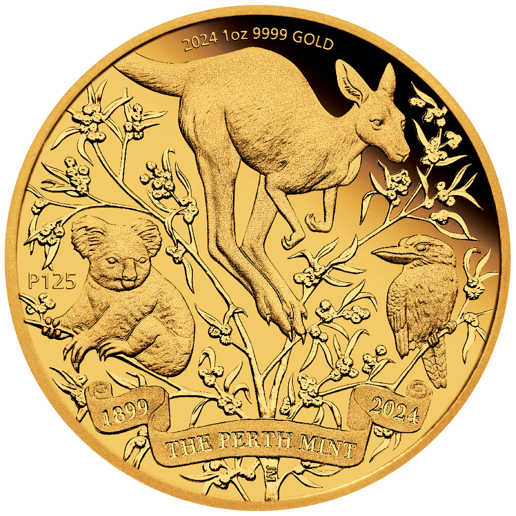 Australische Goldmünze "125. Jahrestag der Perth Mint: Koala, Känguru, Kookabarra" (Proof), 2024, 31,1 g. reines Gold. (0,9999 Proof)